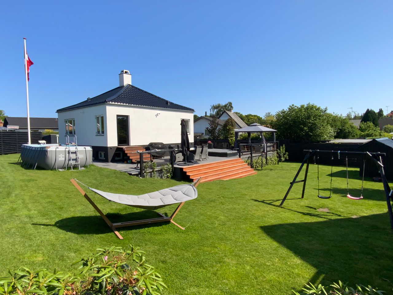 Når du ankommer til ejendommen, fornemmer du straks at alt fremstår i fin stand. Der er anlagt en kæmpe fliseterrasse på mere end 300 m2, hvor der er god plads til at lave et hyggeligt udendørs miljø. Derudover er haven anlagt med græs og der er opsat et pænt hegn rundt om boligen.